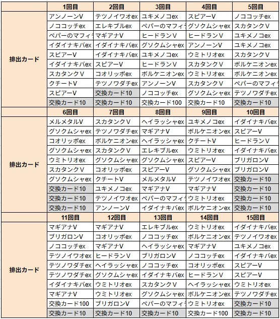 「交換カード10」以外は、100coin交換可能なカードが排出される結果でした。150回中131回は100coin以上で還元率は90.4%です。