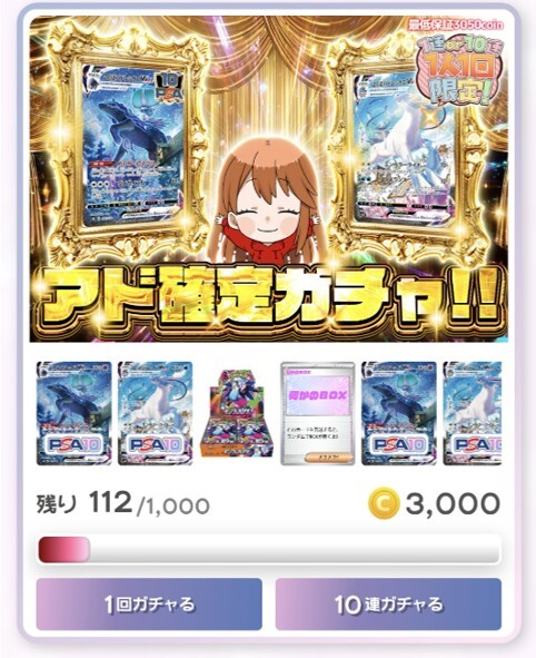1口5,000コインのアド確は、最低保証5,100コインでゲンガーVMAXが狙えるオリパです。1口3,000コインのアド確では、最低保証が3,050コインでこくば・はくばバドレックスのPSA10が狙えます。